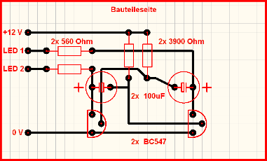Das Bild zeigt die Schaltung für den Warnblinker auf einer Leiterplatte, wobei auf die Bauteileseite geschaut wird, die Leiterbahnen auf der Unterseite sind hier also spiegelverkehrt dargestellt.