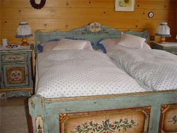Elternschlafzimmer mit Zugang zum Balkon Eingerichtet mit Möbeln der Serie Anno 1700handbemalt, altblau